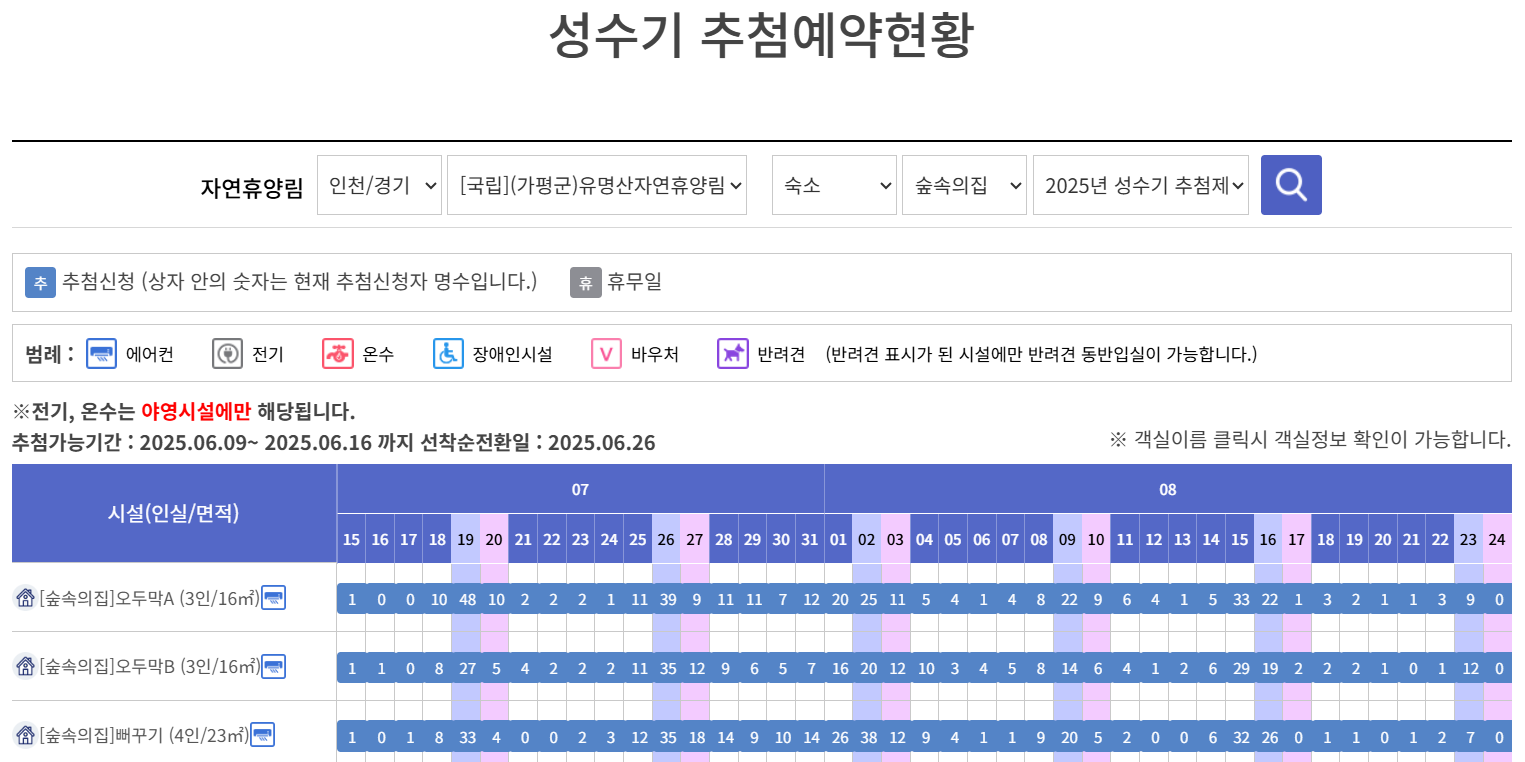 비수기와 주말 추첨 방식과는 별개로 성수기는 오직 추첨제로만 운영되어, 사전 준비와 정확한 일정 숙지가 필수입니다 .