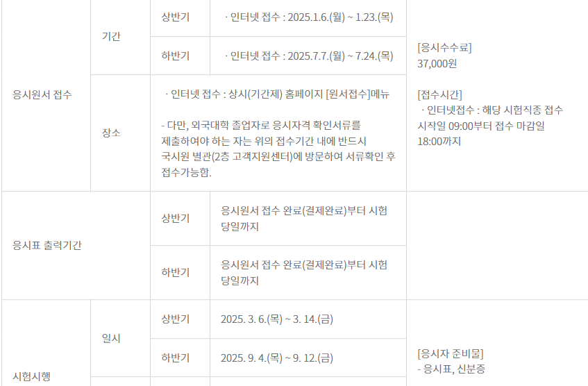 하반기 시험은 9월 초에 시행될 예정이고, 접수는 7월 초에 시작됩니다. 하반기 시험을 노리시는 분들은 곧 다가올 응시 접수 기간을 놓치지 마세요!