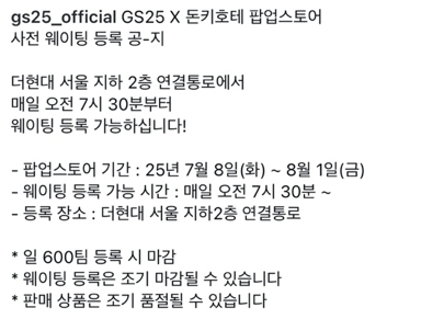 그래서 방문하실 분들은 공식 GS25 인스타그램 또는 더현대서울 홈페이지 공지를 꼭 체크하고 가시는 걸 추천드려요!