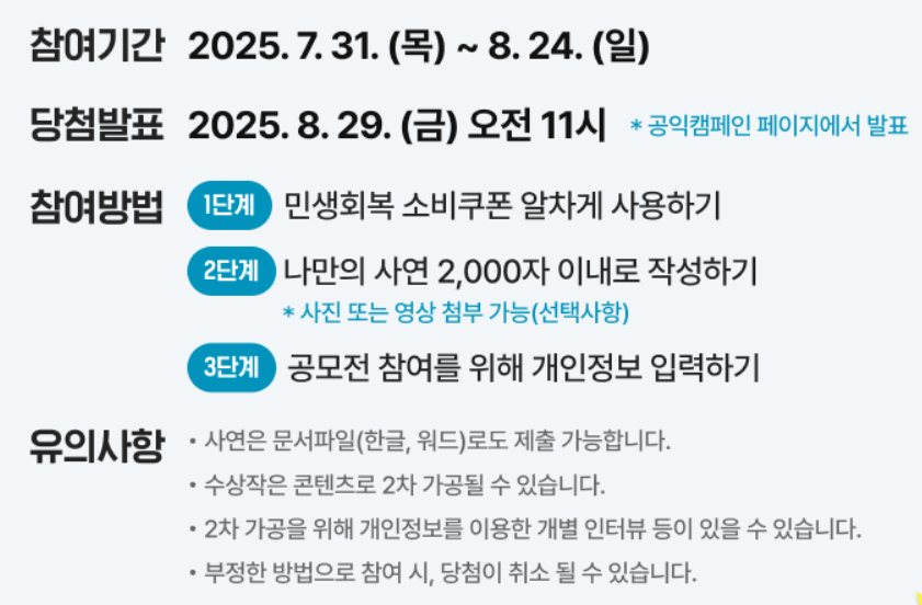 이번 ‘민생회복 소비쿠폰 사연 공모전’은 7월 31일(목)부터 8월 24일(일)까지, 약 3주간 진행됩니다.