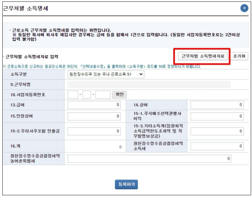 근무처별 소득명세자료를 클릭하면 중도퇴사한 회사의 근로소득을 확인할 수 있어요.