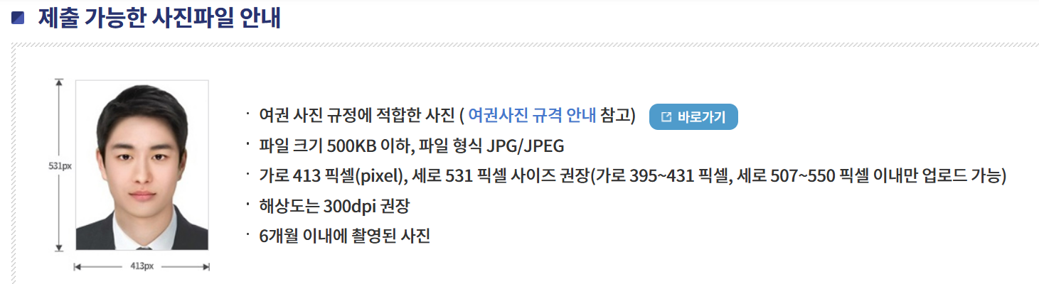 | 크기 | 가로 3.5cm × 세로 4.5cm *사진의 규격은 413 x 531 pixel 을 권장하며, 가로 395~431 pixel, 세로 507~550 pixel 이내 범위 사진으로만 신청이 가능 |