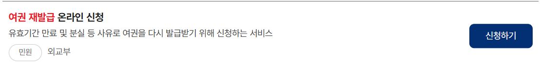 - 검색창에 ‘여권 재발급’ 입력 후 민원 서비스 선택. 아래 신청하기를 클릭하여 바로 신청하기