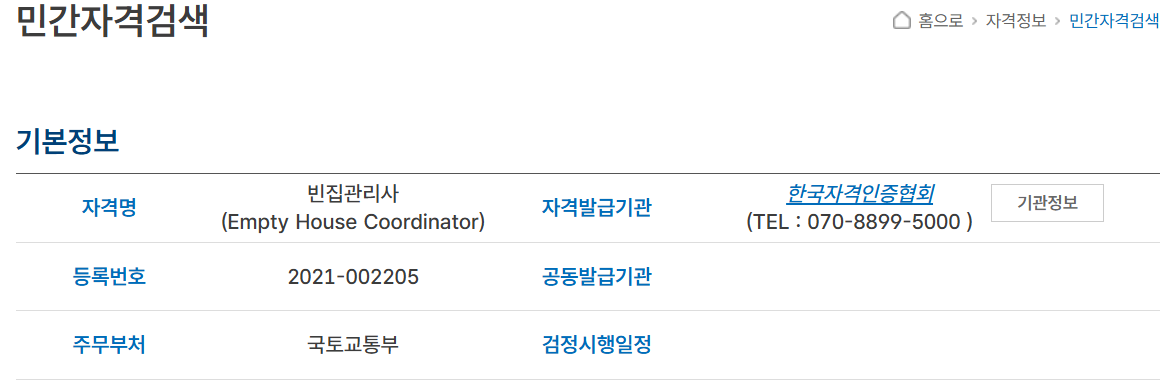 아래 클릭하여 민간자격정보서비스 > 빈집관리사 검색하기