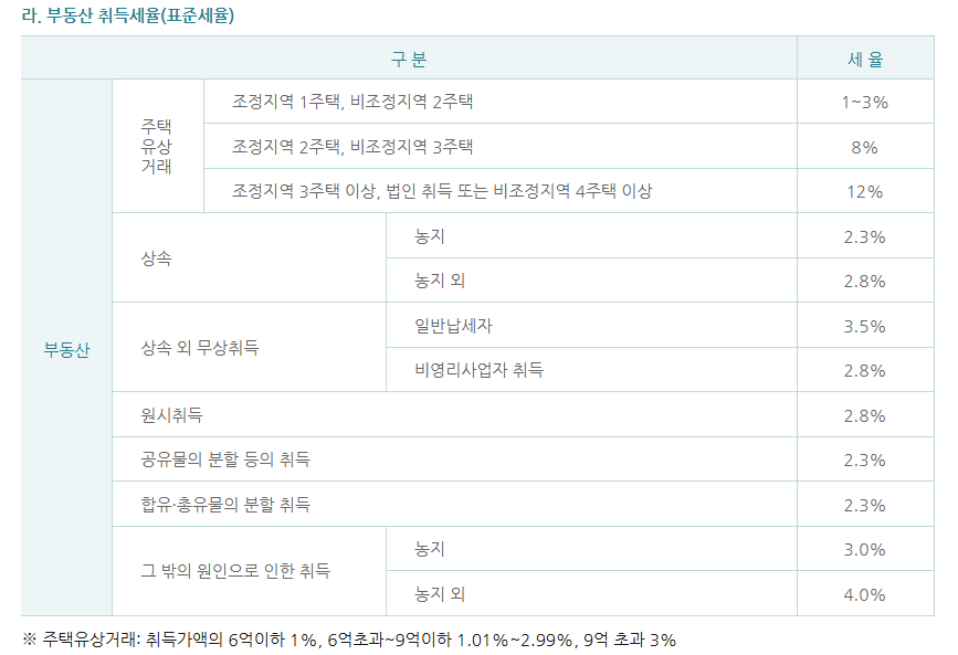 아래 서울시 이택스에 게재된 부동산 취득세율을 확인해보세요. 조정지역 비조정지역, 1가구2주택, 3주택 등에 따라 취득세율이 다르므로 상세 취득세율을 확인하시기 바랍니다.
