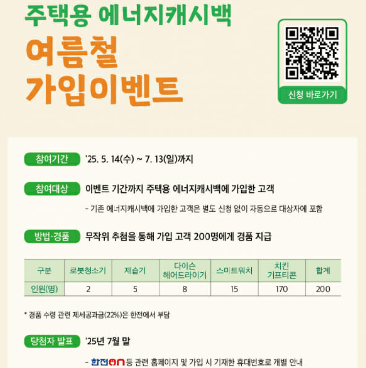 특별한 참여 절차 없이, 에너지캐시백 신청만 하면 자동 응모되니 완전 이득! 가입만 해도 경품 받을 기회가 생기니까 놓칠 수 없겠죠?