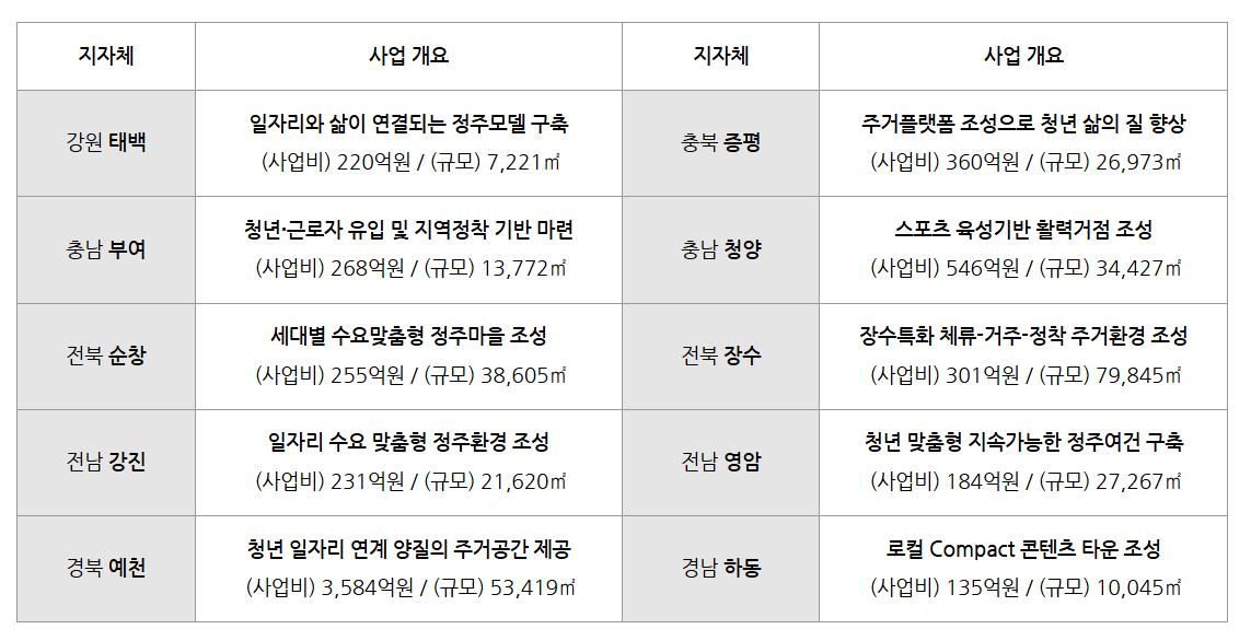 7. 전남 강진은 예전 성화대 캠퍼스 부지를 활용해 공동주택 60호와 타운하우스 10호를 공급할 계획이에요. 여기에 생활지원센터를 함께 조성해 청년들의 취·창업을 지원하고, 지역 소상공인의 성장을 도울 수 있는 거점으로도 활용된다고 해요. 지역에 새로운 일자리가 생기고 활력이 넘치겠죠?
